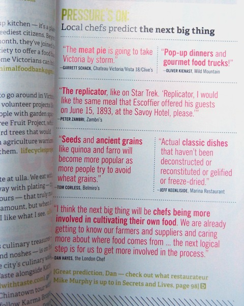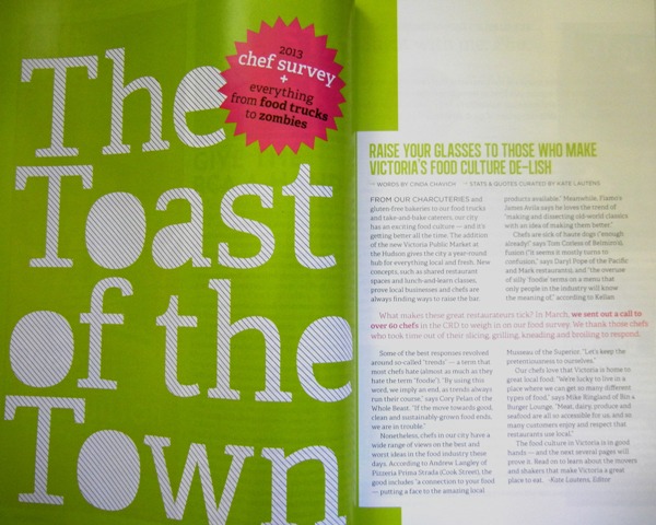 June 2013 was my first “true” issue of Boulevard; it was the first issue I planned and saw through to completion. We decided to do a big food feature that included stories about local food culture (written by the talented Cinda Chavich) and a fun survey that polled chefs around town about everything from their views on kale to their favourite dishes to make at home. I handled the chef survey, contacting chefs, compiling answers and curating the results into a fun story that revealed a little about Victoria’s diverse food culture.